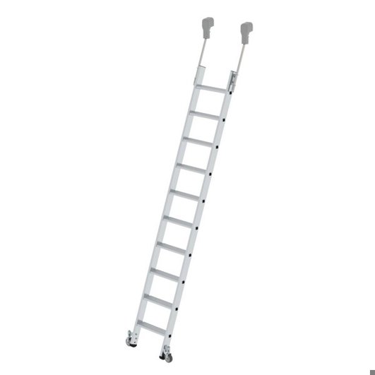 Der innovative Designansatz umfasst ein laufruhiges Fahrwerk am oberen Ende, das Ihnen das mühelose Verschieben der Leiter ermöglicht. Bei Nichtgebrauch lässt sich die Leiter platzsparend verstauen. Die selbstarretierenden Federrollen sowie die rutschsicheren Leiterschuhe sorgen für zusätzliche Sicherheit bei der Nutzung.