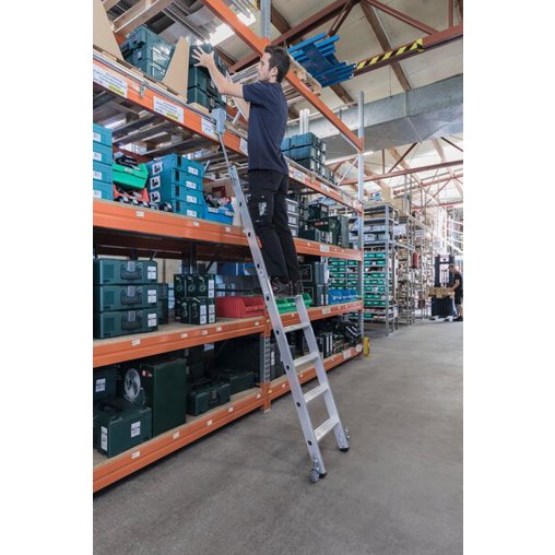 Die Rutschsicheren Leiterschuhe garantieren Sicherheit während der Nutzung. Mit einem Stufenabstand von 235 mm und einer Neigung von 70° gewährleistet diese Leiter einen optimalen Zugang zu schwer erreichbaren Regalen. Die großzügige Breite von 420 mm ohne Rollen bzw. 600 mm mit Rollen bietet zusätzlichem Komfort. Sie ist für eine maximale Belastung von bis zu 150 kg ausgelegt, was sie ideal für den Einsatz in Lagerhäusern und Werkstätten macht.