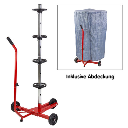 Mit einer robusten Schutzhülle aus abwaschbarem Nylon bleiben Ihre Reifen zudem vor Staub und neugierigen Blicken geschützt. Der Reifenständer ist fahrbar und verfügt über eine separate Bremse, die ein ungewolltes Wegrollen verhindert, wodurch er besonders sicher und stabil ist.