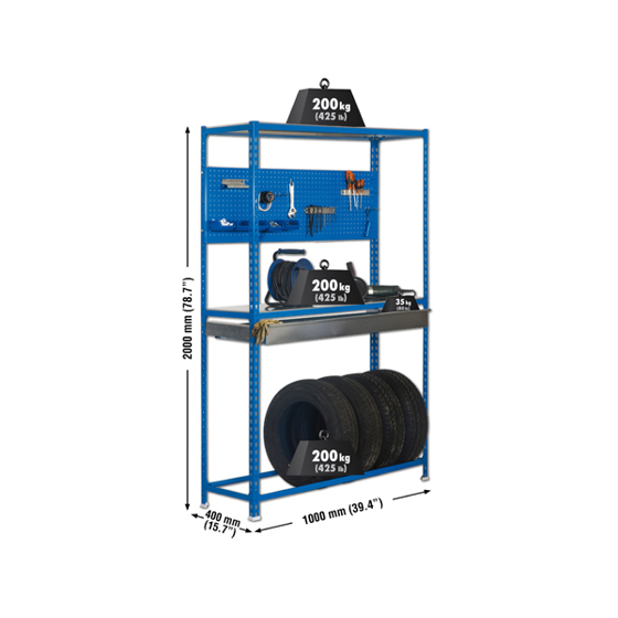 Produktinformationen "Reifenregal Simonracing - Verzinkt/Blau - 3 Ebenen - 600 kg Feldlast - H 2000 mm x B 1000 mm x T 400 mm"