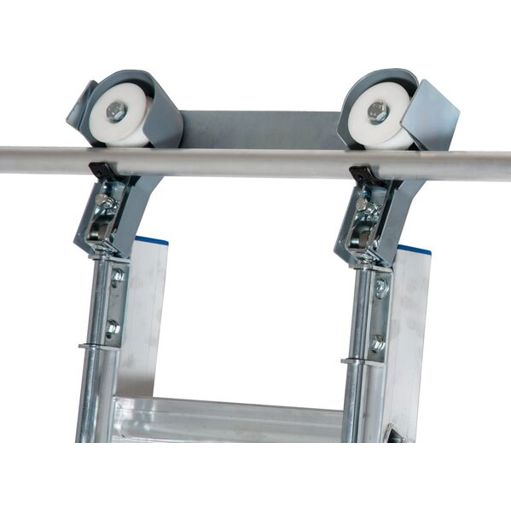 Die hochfest verbördelten Stufen bieten eine sichere Verbindung zu den Holm und sind mit profilierten Stufen ausgestattet, die eine Tiefe von 80 mm haben. Dadurch erhalten Sie nicht nur einen bequemen Stand, sondern auch einen sicheren Aufstieg. Die zwei Federrollen mit einem Durchmesser von 80 mm ermöglichen ein müheloses Verfahren der Leiter, während die Zweikomponenten-Fußstopfen für einen stabilen Stand während der Benutzung sorgen.